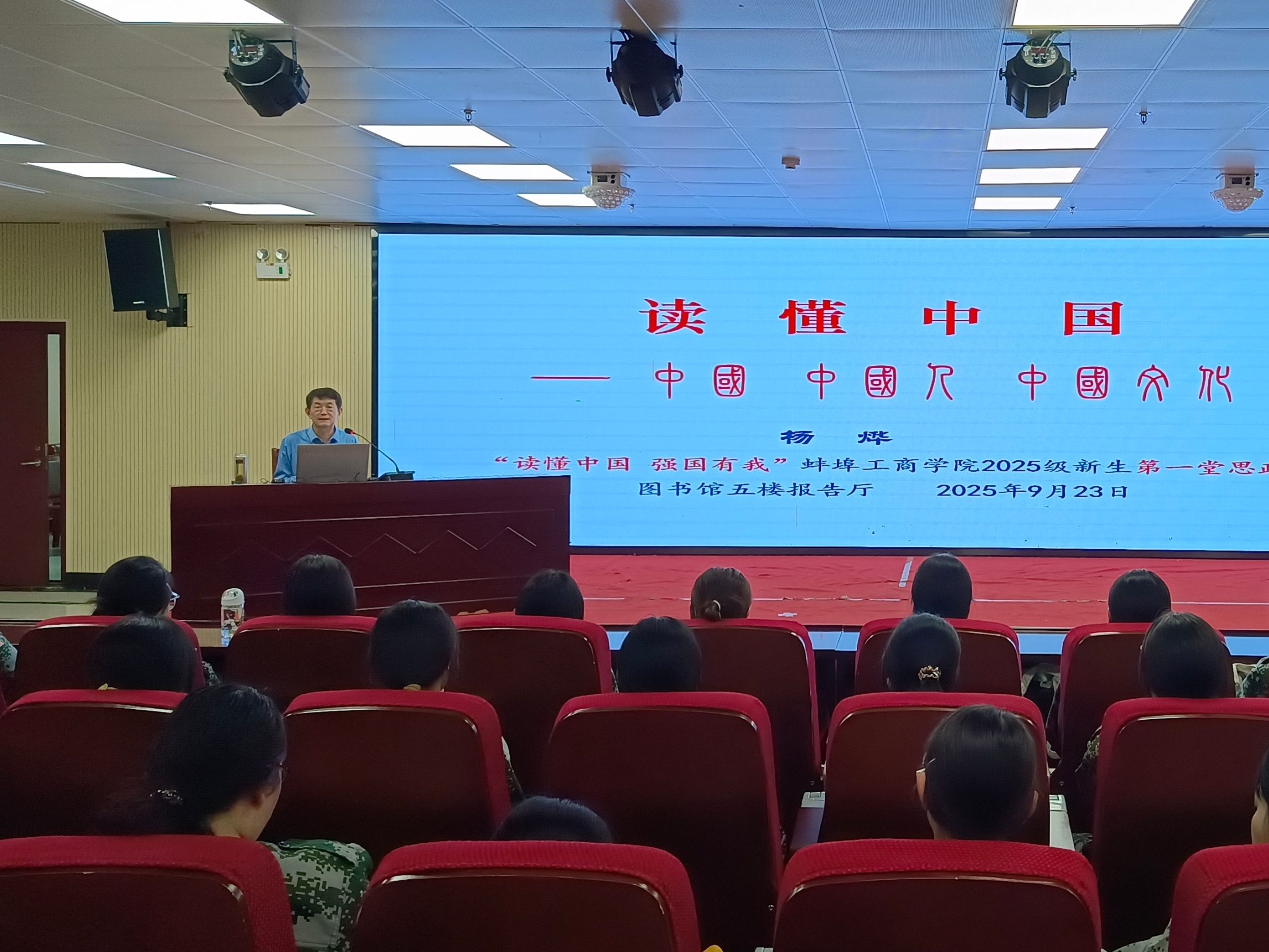 近日,由蚌埠工商学院关心下一代工作委员会联合党委组织部共同举办的“读懂中国 强国有我——蚌埠工商学院2025级新生第一堂思政课”主题报告会顺利开讲。两场报告会分别于 9 月 23 日晚、9 月 25 日晚举行,学校督导专员兼党委书记杨烨、计算机与人工智能学院专职辅导员褚飞扬、22级国际商务学院学生代表梁紫薇受邀开讲,为800余名新生送上意蕴深厚、启迪人心的“开学第一课”。报告会由党委组织(统战)部部长刘艳主持。