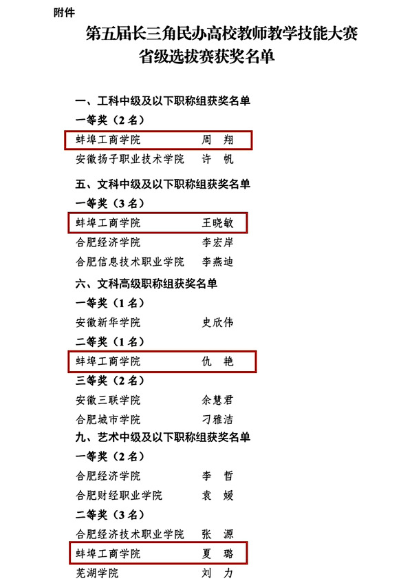 我校四位教师的优异表现,是学校持续深化教育教学改革、强化师资队伍建设的生动体现,也反映了我校在推动内涵式发展、加强中青年教师培养方面的扎实成效。学校将以此为契机,进一步坚持“以赛促改、以赛促教、以赛促学”的导向,不断优化教师发展机制,完善教学评价体系,营造潜心育人的良好生态,持续推动教育教学质量迈上新台阶,为培养更多担当民族复兴大任的高素质应用型人才作出新的更大贡献!(文/赵慧婷 审核/经庭如)