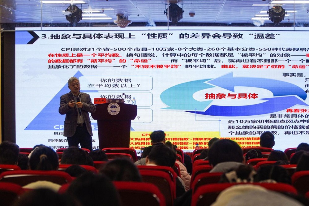 讲座开场,谢忠秋教授从“道法自然”“道法人性”“道法一体”的东方哲学视角出发,引导大家思考宏观规律与微观现实之间的关系。随即他以“买菜”这一生活场景为例,引出主题:“为何国家CPI数据显示微降,居民却常感觉物价上涨?”谢教授围绕宏观数据与个体感受之间的差异,即“温差”是什么、为什么、怎么办,展开系统阐述。