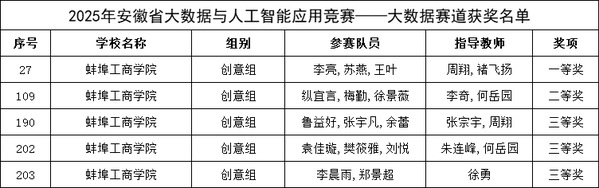 近日,2025年安徽省大数据与人工智能应用竞赛获奖名单公布,我校参赛队伍凭借扎实的专业基础、创新的设计思维和出色的临场表现,荣获一等奖1项,二等奖1项,三等奖3项,展现出我校在人才培养方面的卓越成效。