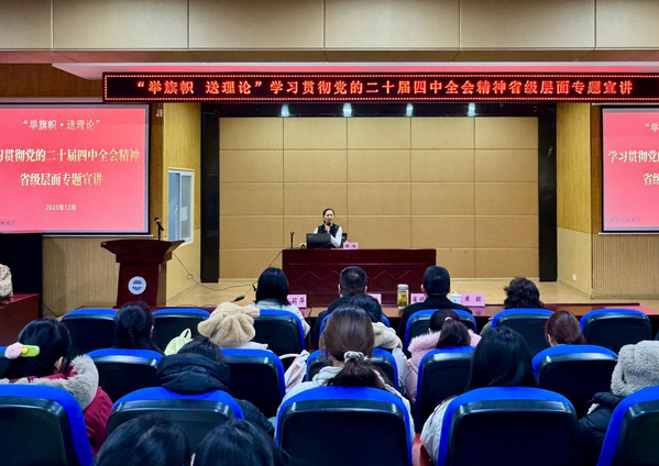 12月26日上午,省委讲师团“举旗帜 送理论”学习贯彻党的二十届四中全会精神专题宣讲在我校格物楼学术报告厅举行。宣讲会由省委讲师团理论宣讲专家库成员、安徽交通职业技术学院思政课教师路政主讲。蚌埠市委讲师团团长崔晓东,禹会区委宣传部副部长崔莉萍,校党委委员、校长助理、党委宣传部部长徐键,校党委委员、团委书记黄颖出席活动,与240余名学生代表一同聆听宣讲。