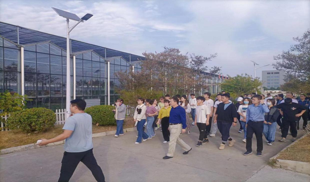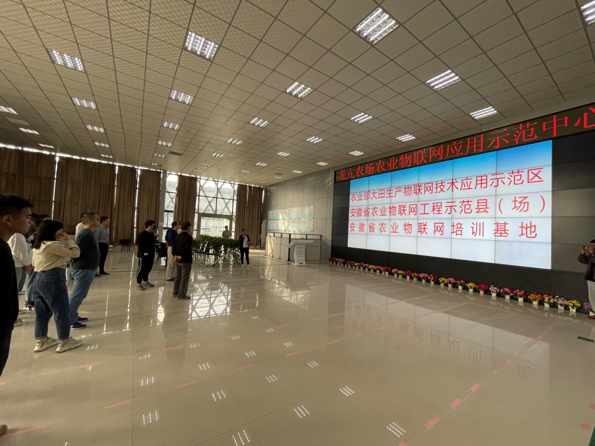 随后,师生们到达第二站——安徽省农垦集团龙亢农场。解放前,龙亢农场这里是远近闻名的“四十五里烟袋湖”,野草丛生,土匪出没,行人罕至,解放以后,周边农民在此开垦了少量土地,但因土质瘠薄,远离村庄,后大多被抛荒。直到1957年,安徽省委决定开垦烟袋湖,同年勘探,次年筹建,经过农垦职工的艰苦拼搏,1959年初,龙亢农场正式建成。直到今天,龙亢农场已经成为了安徽农垦乃至全国农垦的发展改革先锋队,现在的龙亢农场是安徽省生态镇、国家农村改革试验区、蚌埠国家农业科技园核心区,农业部大田物联网应用示范区等,是蚌埠西部地区经济增长极和安徽现代农业的展示窗口。龙亢农场历经几代农垦人的辛勤开垦,就像绿色的农业一样,生机勃勃,生生不息。在龙亢农场解说员的带领下,师生们参观了农业物联网示范指挥中心、智能温室大棚、农业科技园、景观工程等,一路上大家认真聆听,不时发问,表现出对现代农业和农场历史的浓厚兴趣。大家表示,农场历史中蕴含有一种艰苦奋斗、勇于开拓的农垦精神,这种精神将激励我们在今后的工作和学习中,发扬艰苦奋斗、爱岗敬业的优良传统,尽职尽责,努力工作,努力学习。