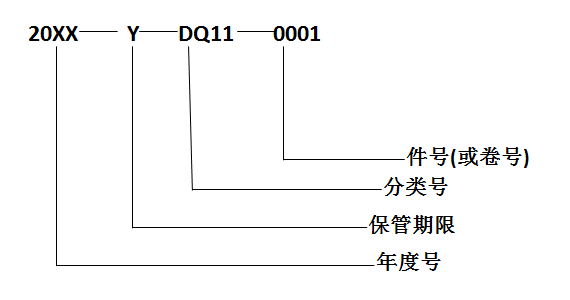 年度号+保管期限+分类代码+件号(或案卷号),用“—”连接。具体档案标识如下: