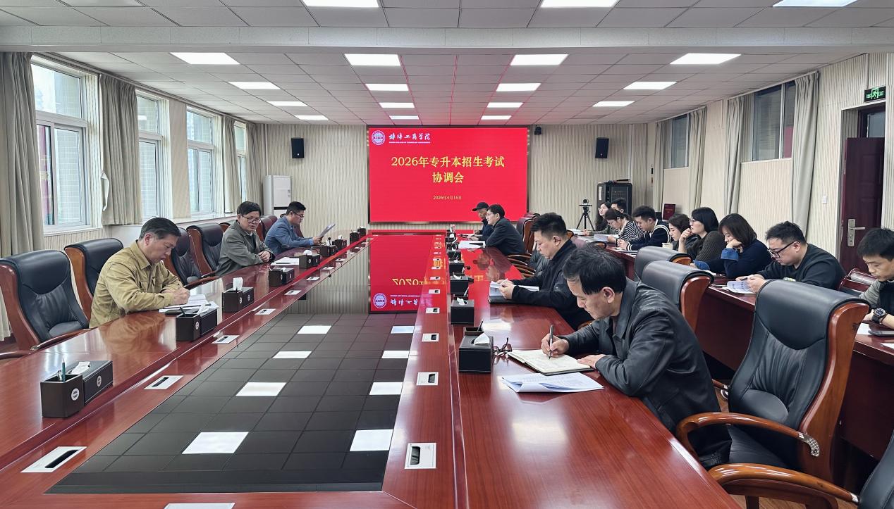 为全面落实省教育厅及省教育招生考试院相关文件要求,统筹推进本年度专升本招生考试各项工作,4月16日上午,我校2026年专升本招生考试工作协调会在行远楼五楼视频会议室召开。校长刘福成出席会议并讲话,相关职能部门、各二级学院负责人及招生办公室工作人员参加会议,会议由教务处处长经庭如主持。
