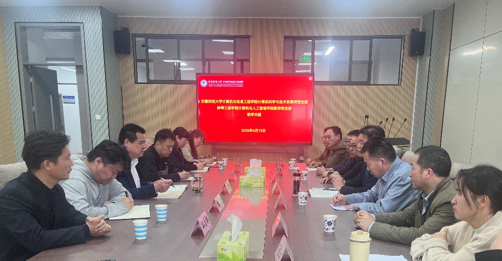为扎实开展树立和践行正确政绩观学习教育,推动基层党建与专业建设、人才培养等深度融合。我校计算机与人工智能学院院长兼党总支书记徐军率队教师党支部教师党员代表赴安徽财经大学计算机与信息工程学院,与该院计算机科学与技术系教师党支部开展联学共建活动。安徽财经大学计算机与信息工程学院党委书记刘朝新、双方教师党支部教师党员代表参加活动。